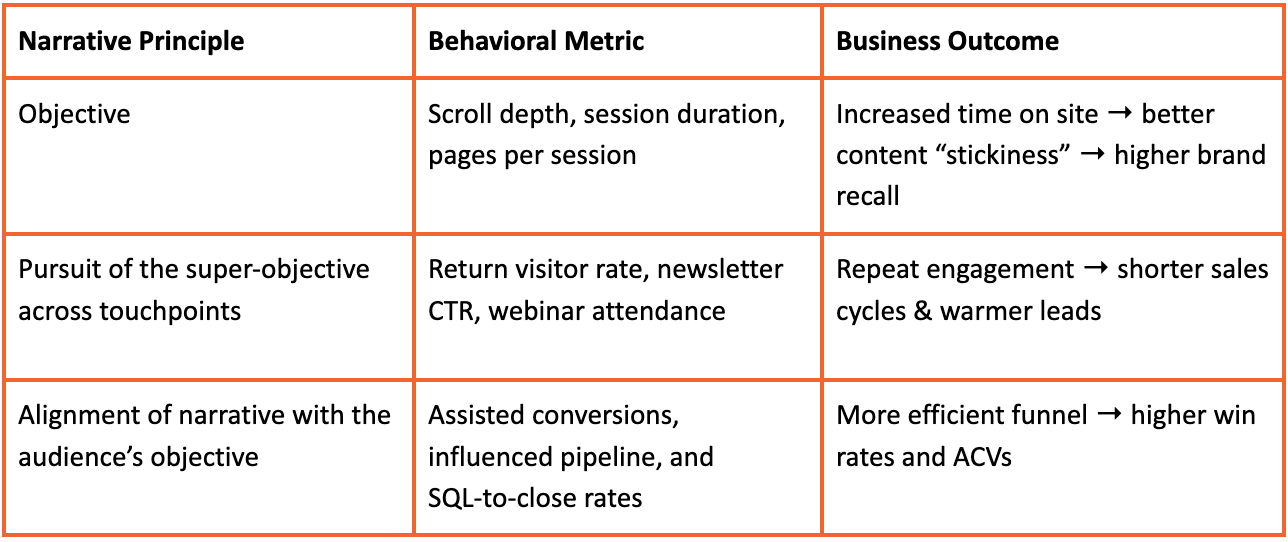 When we connect narrative principles (like Objectives) to a verifiable behavior change, then tie that behavior to pipeline outcomes, we stop arguing for “storytelling” as a nice-to-have and start presenting it as a growth strategy.